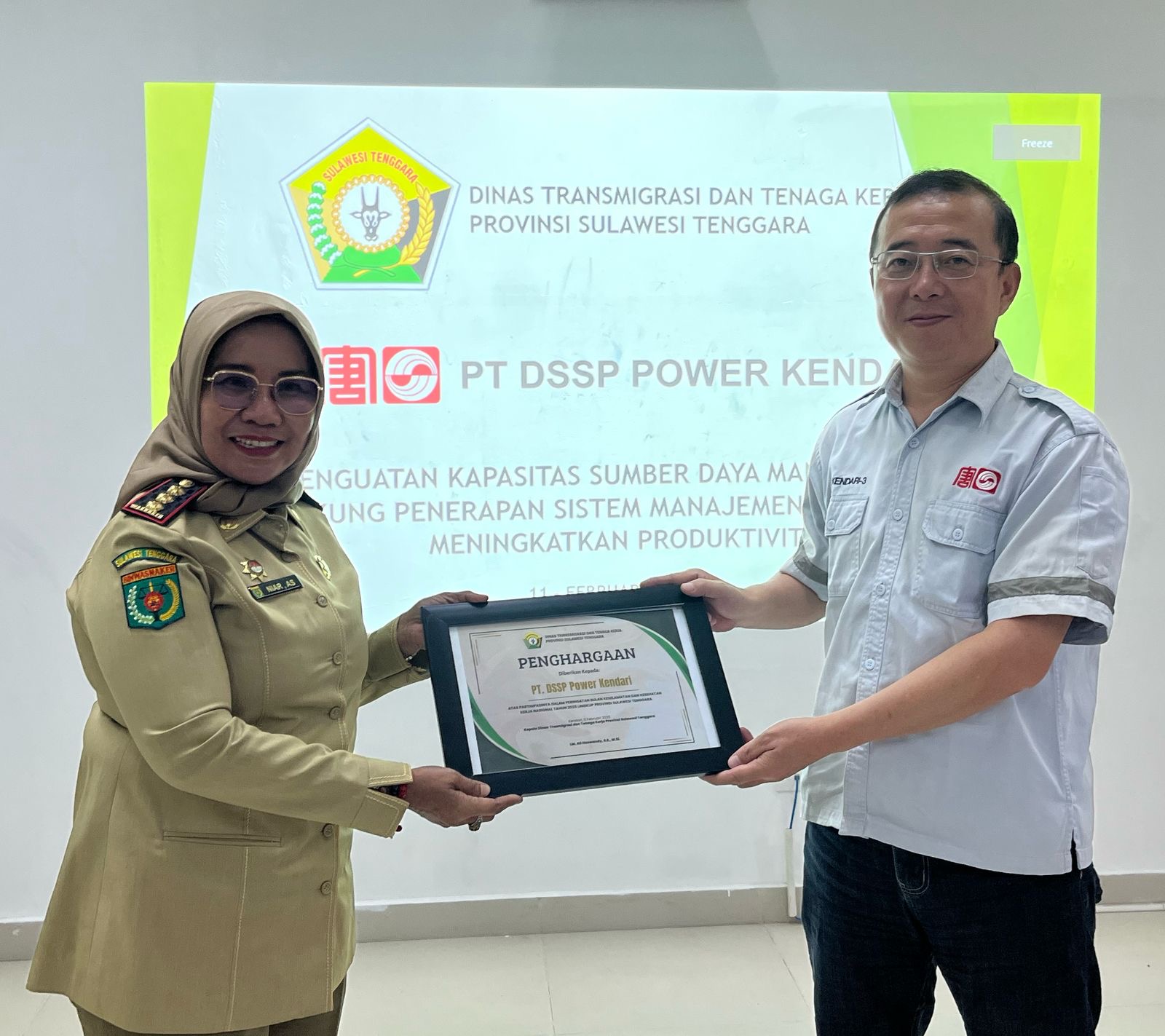 Pada kesempatan yang sama, Asnia juga menyerahkan sertifikat partisipasi PT DSSP Power Kendari dalam bulan K3 Nasional kepada perwakilan Manajemen direktur PT DSSP Power Kendari, Wang Quanmin.
