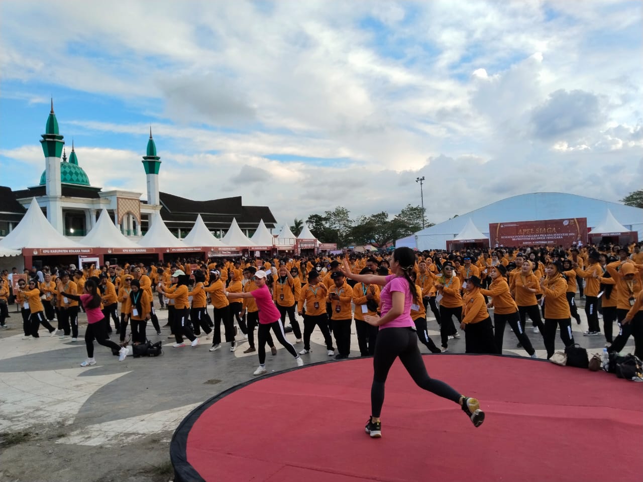 “Besok semua petugas pemilu akan sibuk dan lembur. Jadi tetap jaga kesehatan dan kebugaran badan, salah satunya dengan menjalankan kegiatan olahraga seperti ini, senam”, pesannya.