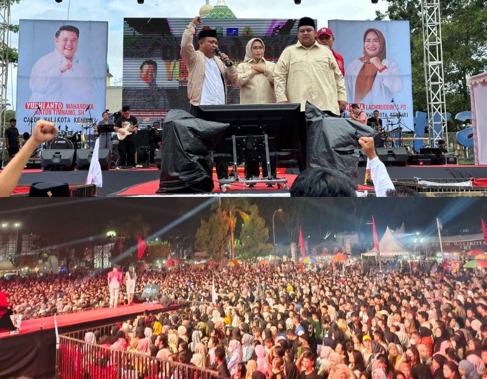 LENSATIMOR.COM, KENDARI – Pelataran Eks MTQ Kota Kendari dipenuhi simpatisan dan relawan Calon Wali Kota dan Wakil Wali Kota Kendari, Yudhianto Mahardika Anton Timbang-Hj. Nirna Lachmuddin, Kamis (29/08/2024) malam.