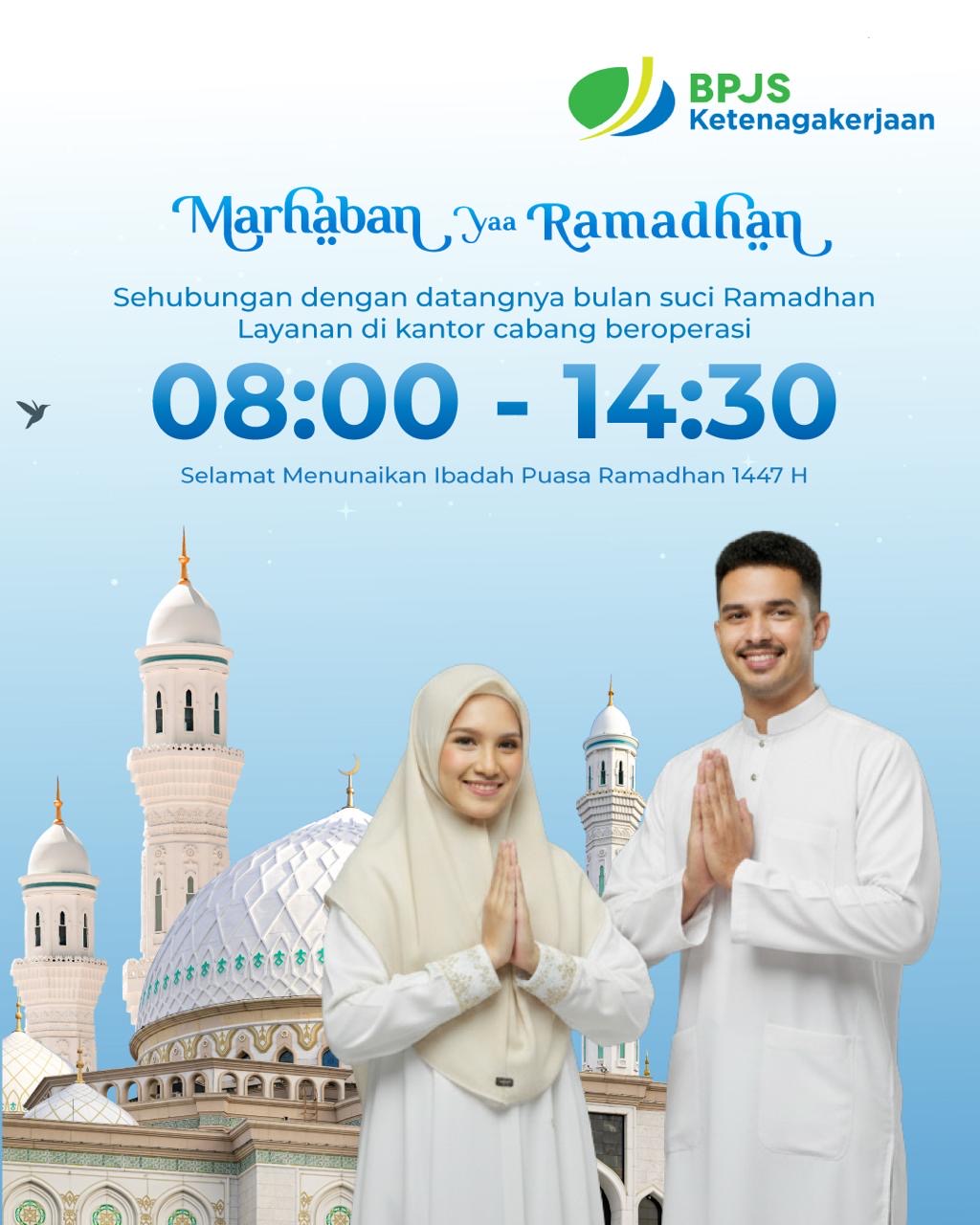 Selama periode Bulan Ramadan, jam layanan operasional kantor BPJS Ketenagakerjaan disesuaikan menjadi mulai pukul 08.00 hingga pukul 14.30 sesuai waktu setempat.