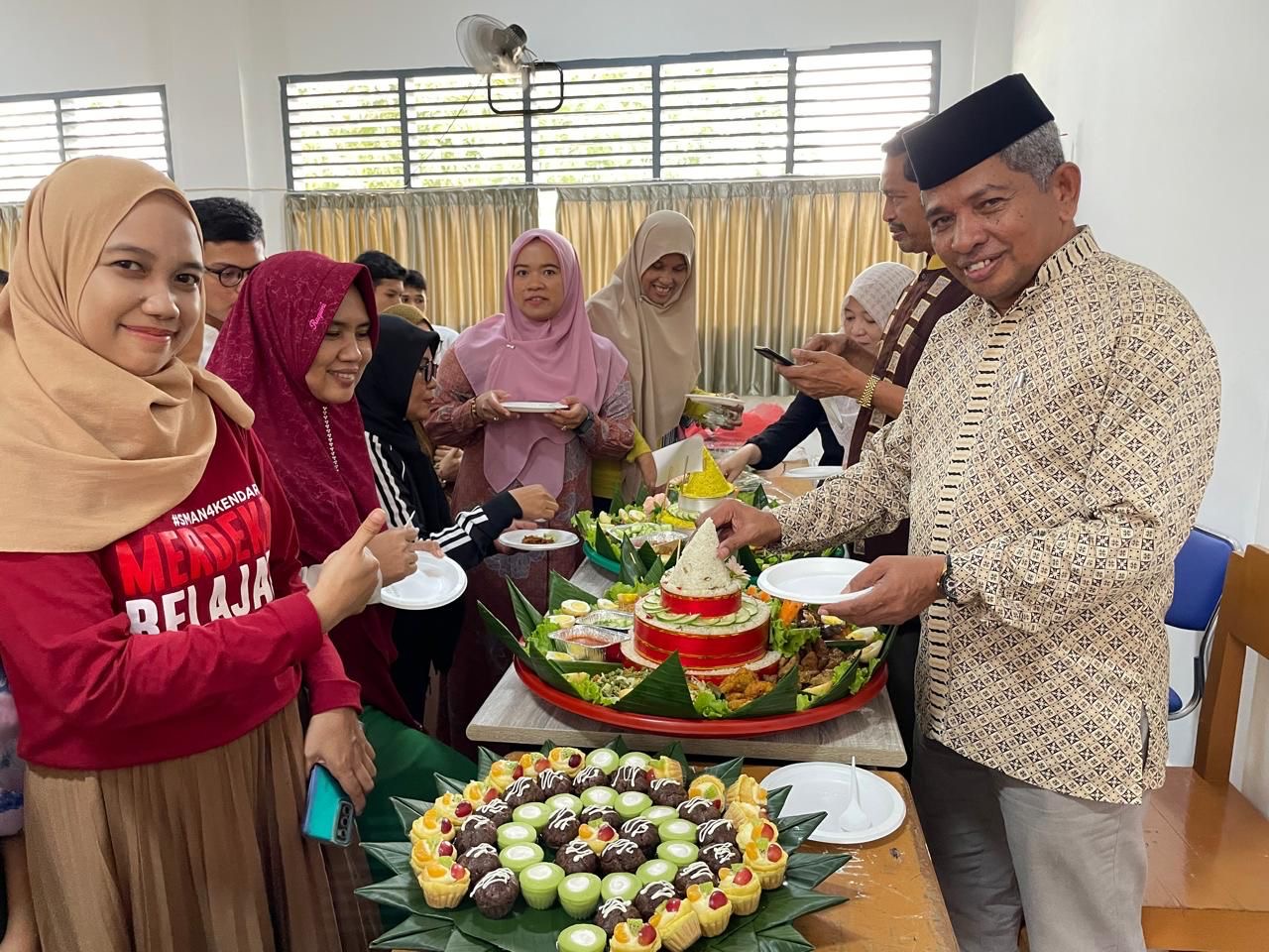 Kepala SMAN 4 Kendari, Liyu bersama jajaran dan siswa foto bersama dalam syukuran kelas belajar baru SMAN 4 Kendari, Jumat (21/02/2025).