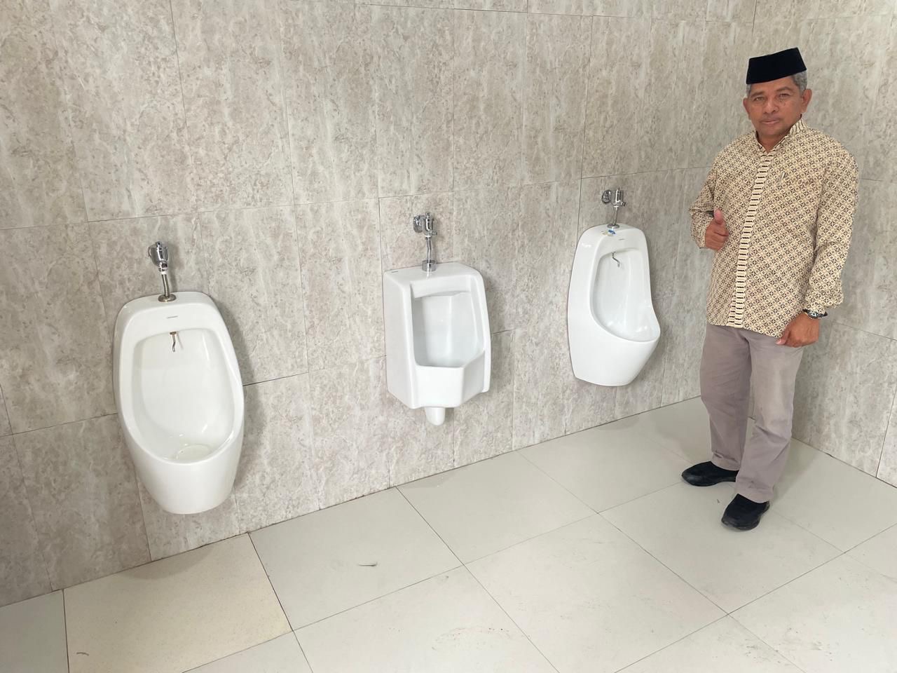 Kepala SMAN 4 Kendari, Liyu memperlihatkan fasilitas (toilet) ruang kelas baru sekolah. Fasilitas yang dibangun berstandar internasional.