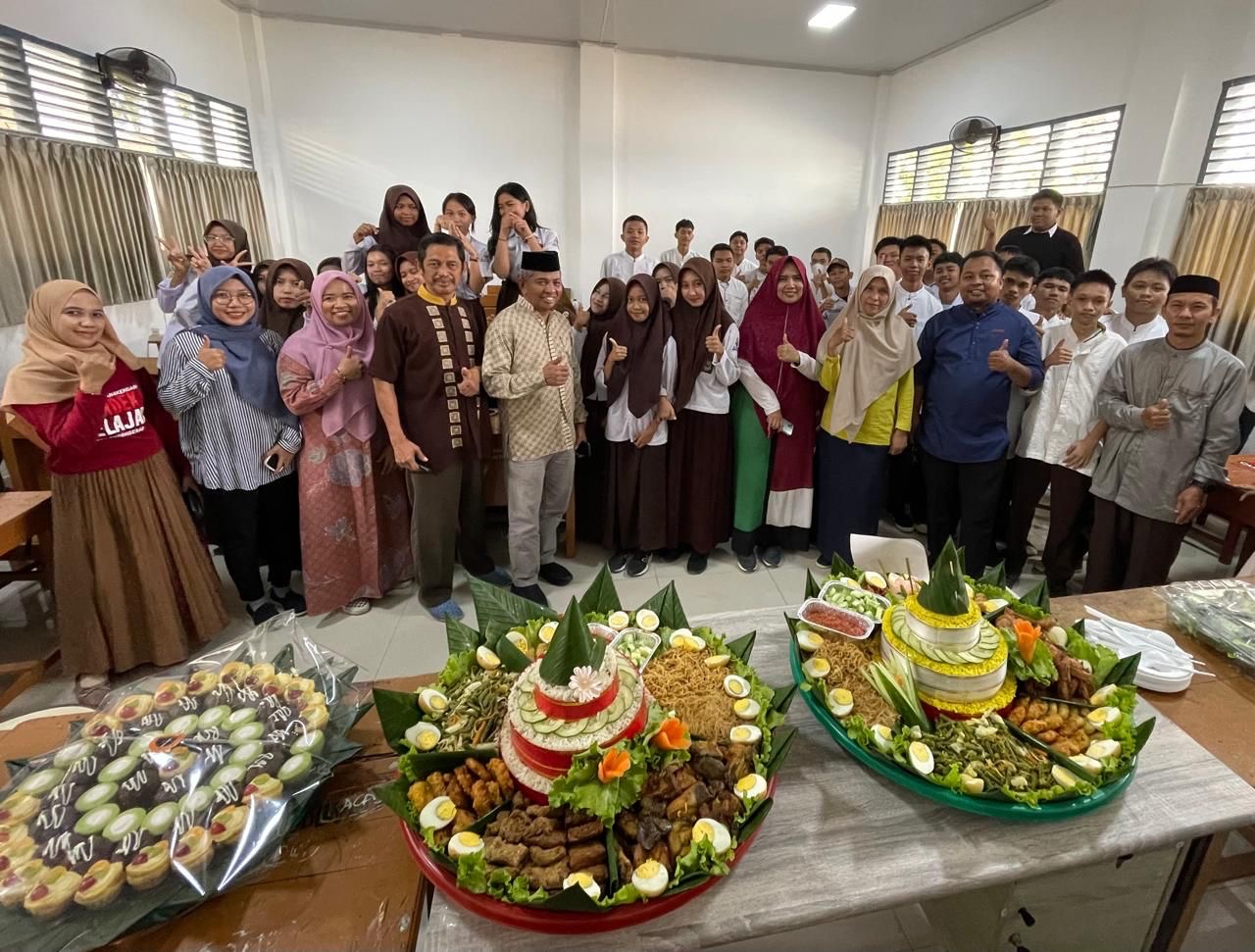 Kepala SMAN 4 Kendari, Liyu bersama jajaran dan siswa foto bersama dalam syukuran kelas belajar baru SMAN 4 Kendari, Jumat (21/02/2025).