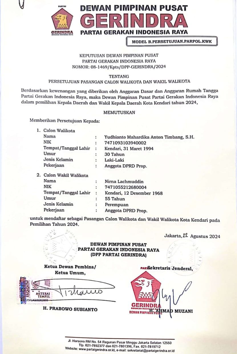 Penyerahan dukungan Partai Gerindra kepada Pasangan Calon (Paslon) Calon Wali Kota dan Wakil Wali Kota Kendari Yudhianto Mahardika-Hj. Nirna Lachmuddin memantapkan langkah keduanya menuju Pilwali Kota Kendari.