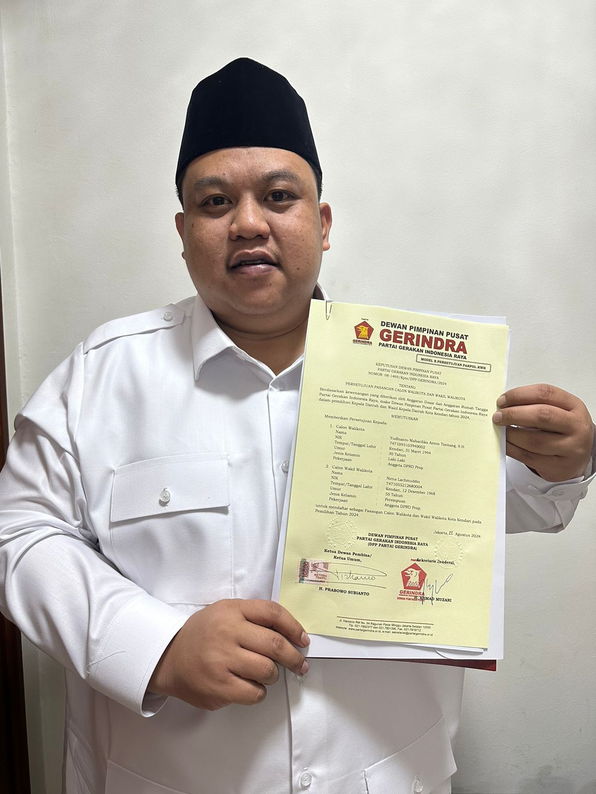 Calon Wali Kota Kendari, Yudhianto Mahardika Anton Timbang bersyukur, Partai Gerindra memberikan dukungan kepada dirinya dan Hj.Nirna Lachmuddin untuk bertarung di Pilwali Kendari 27 November 2024