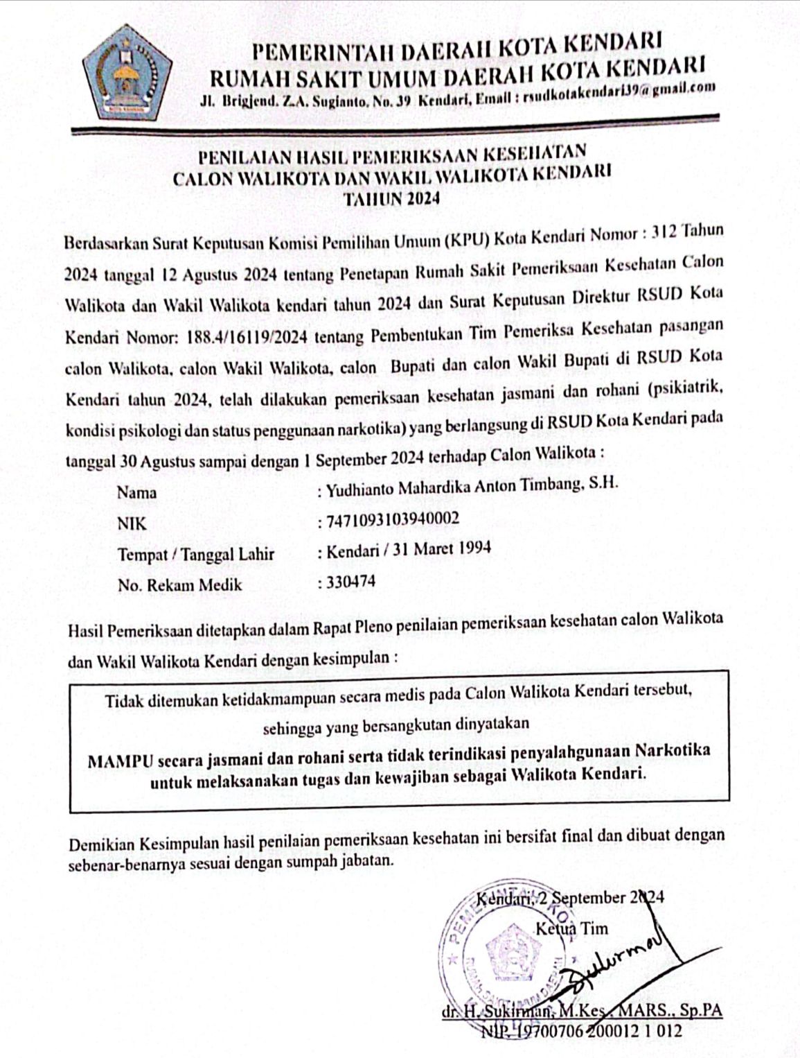 Ketua Tim Pemeriksa Kesehatan RSUD Kota Kendari, dr.Sukirman mengungkapkan, Paslon Yudhi-Nirna dinyatakan sehat jasmani dan rohani berdasarkan hasil pemeriksaan tim medis RSUD Kota Kendari.