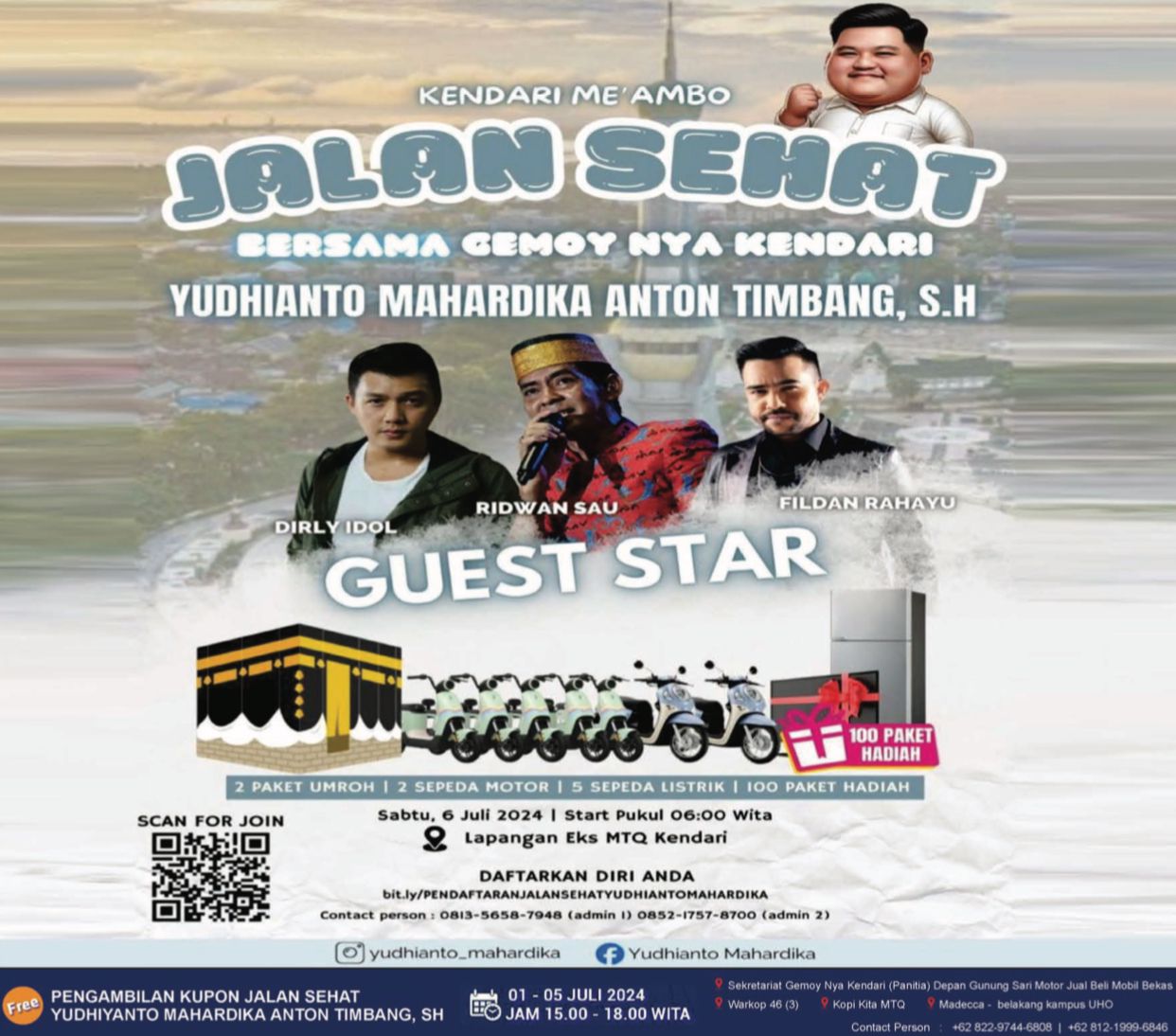 Sekedar informasi, bagi masyarakat yang ingin mengikuti jalan sehat bersama Gemoy Nya Kendari bisa langsung mendaftar melalui link bit.ly/PENDAFTARANJALANSEHATYUDHIANTOMAHARDIKA.